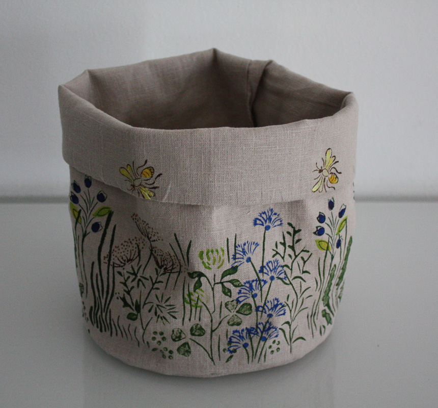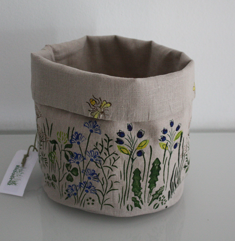 €45.00Leinen Brotkorb mit Kleeblüten, Wiesenknopf und violette Wiesenblumen 20 cm hoch, 18 cm im Durchmesser