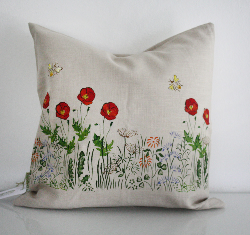 Kissenbezug aus reinem Leinen mit Mohnblüten, Wegwarte, Schafgarbe und Bienen. Maße: 40 x 40 cm