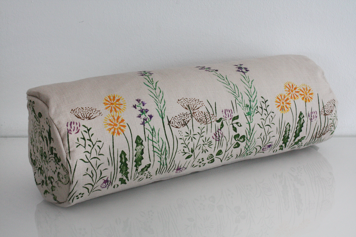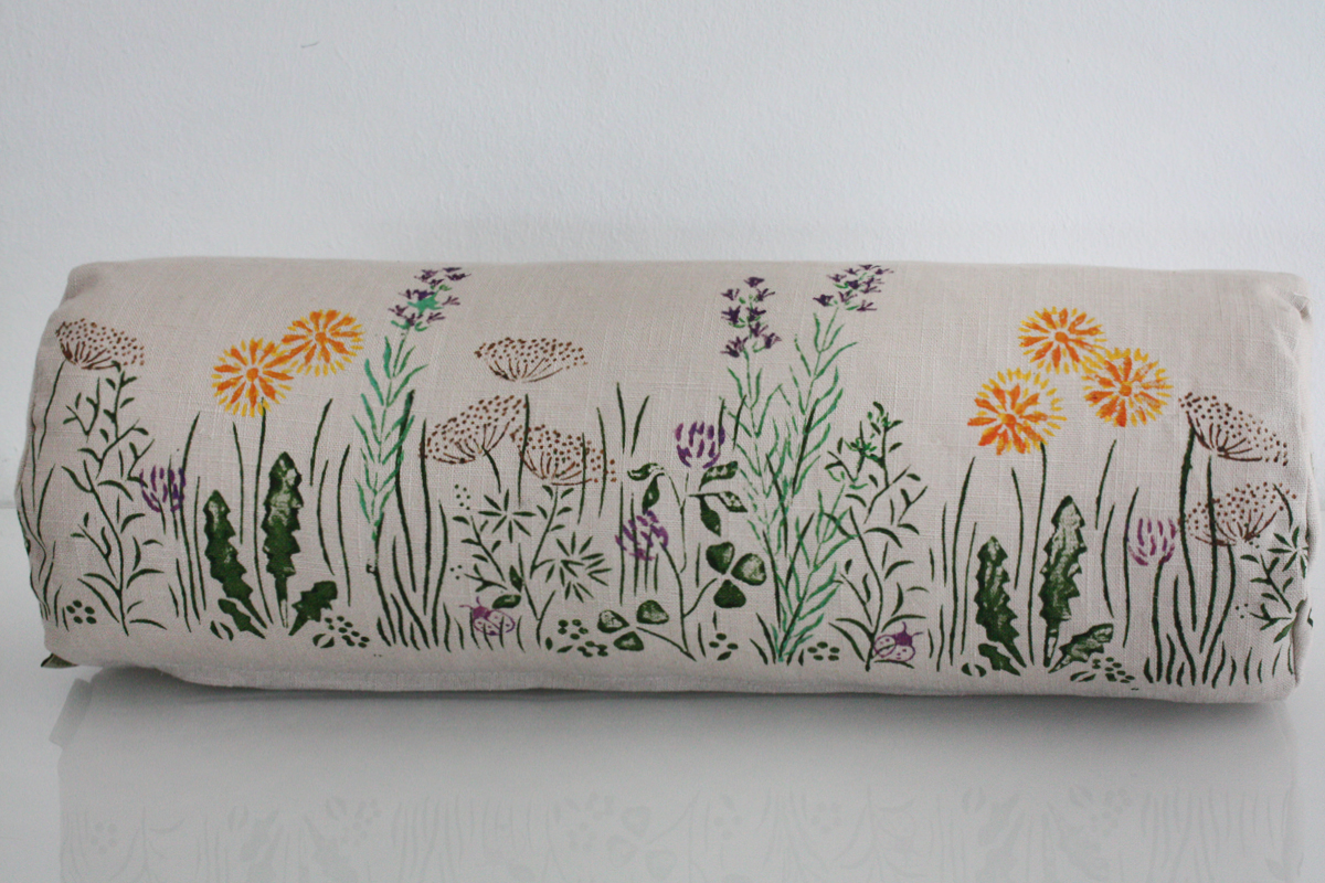 Nackenrollenbezug aus reinem Leinen 40 cm lang und 15 cm Durchmesser, handbedruckt.