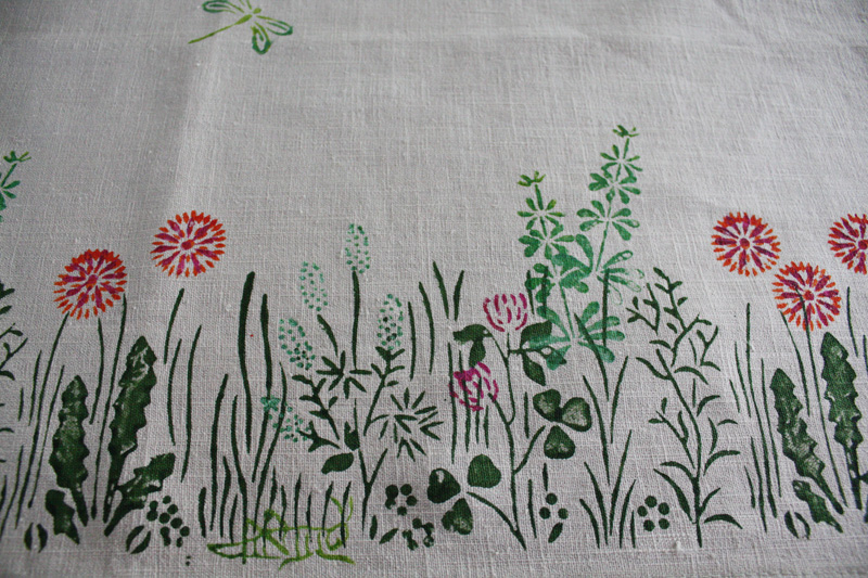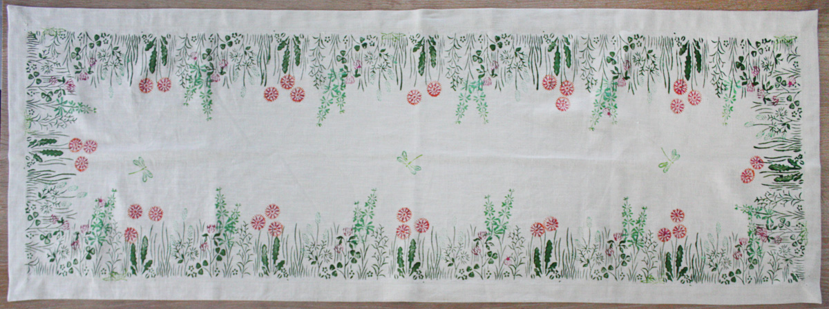 Naturfarbener handbedruckter Leinentischläufer, roter Klee, frische grüne Wiesenpflanzen und schwebende Libellen und grünen Grashüpfer. Maße: 150 x 50 cm