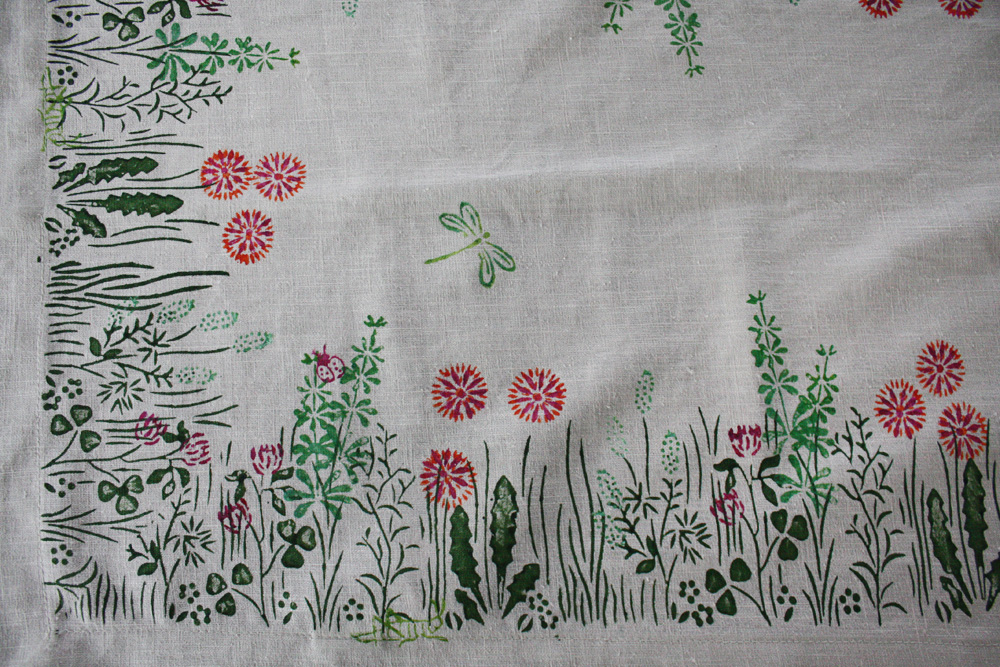 Mit erlesenen handgefertigten Holz-/Messingmodeln werden Motive einer Blumenwiese auf reinem naturfarbenem Leinen gedruckt, mit farbechten Stofffarben. Jedes Stück ein Unikat.