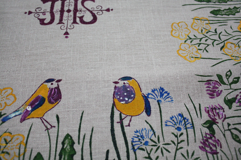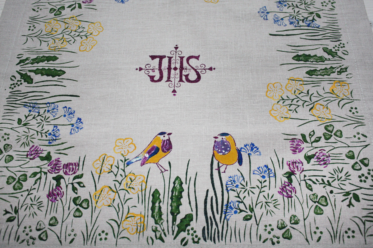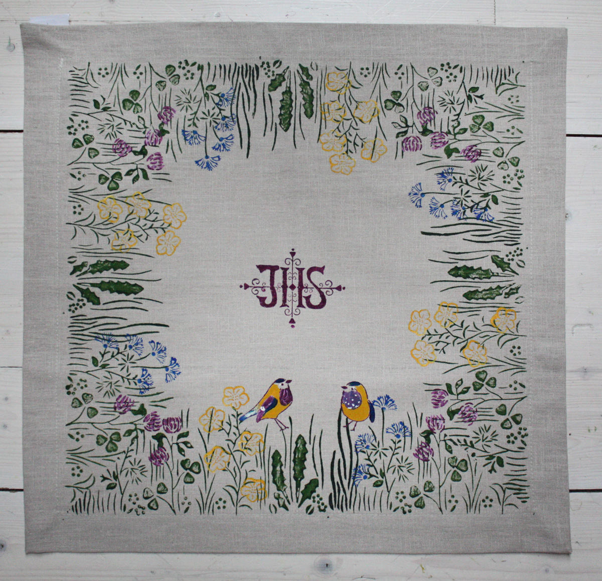 Zwei bunte Vögelchen in der Wiese mit Klee, Dotterblumen und Kornblüten, in der Mitte ist das IHS Monogramm. Maße: 50 x 50 cm