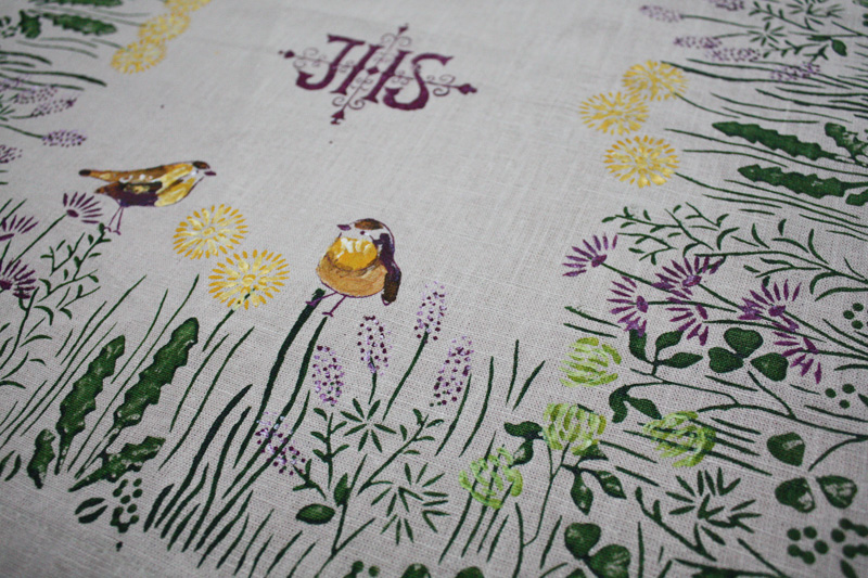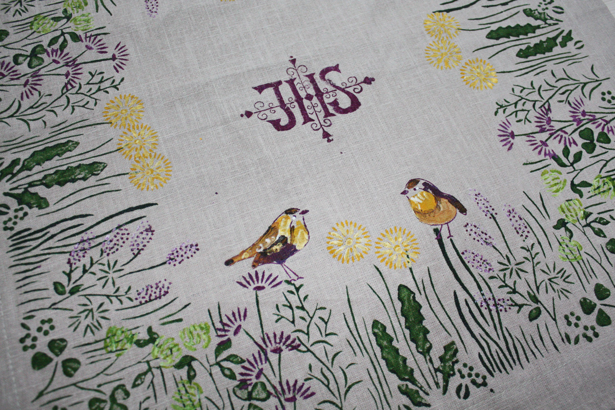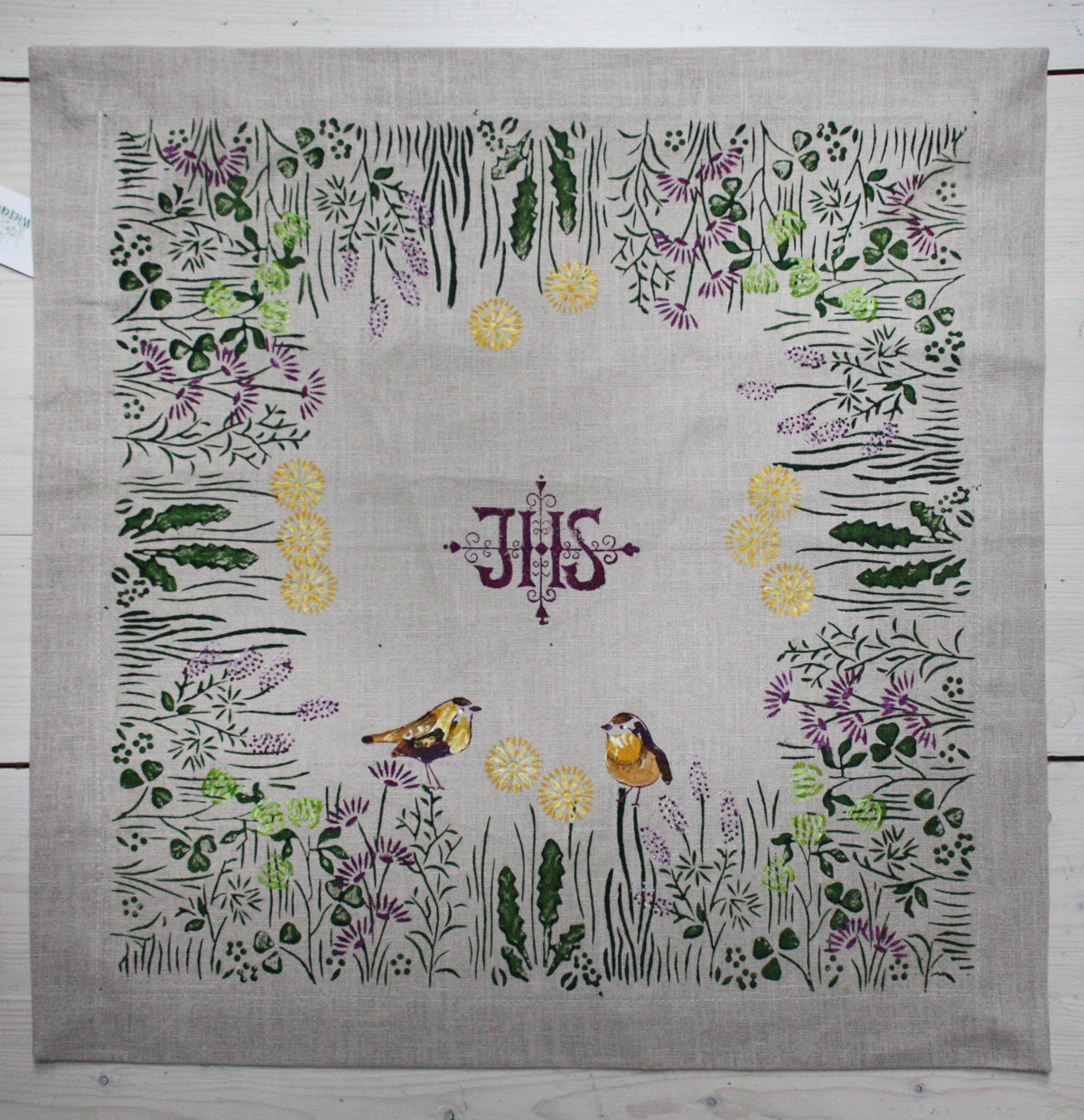 €44.00Zwei bunte Vögelchen in der Wiese mit Klee, Dotterblumen und Kornblüten, in der Mitte ist das IHS Monogramm. Maße: 50…