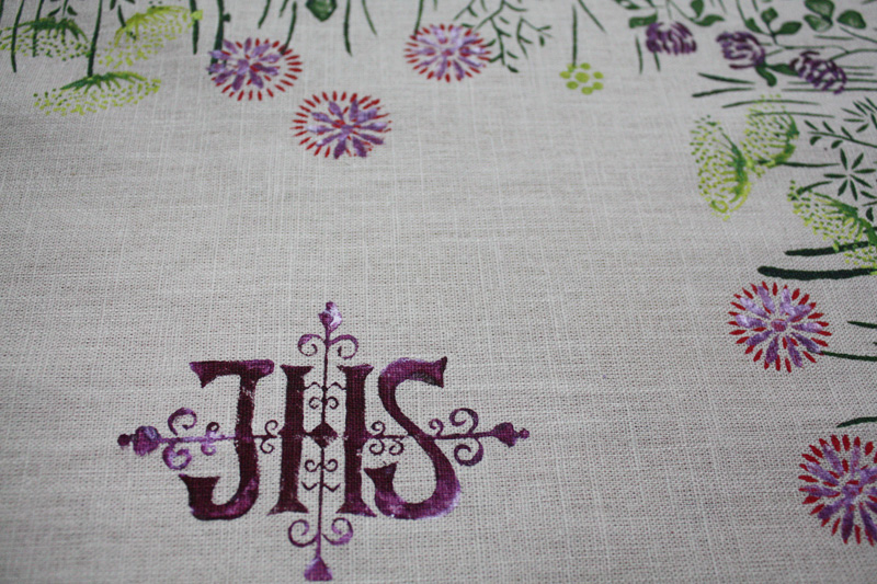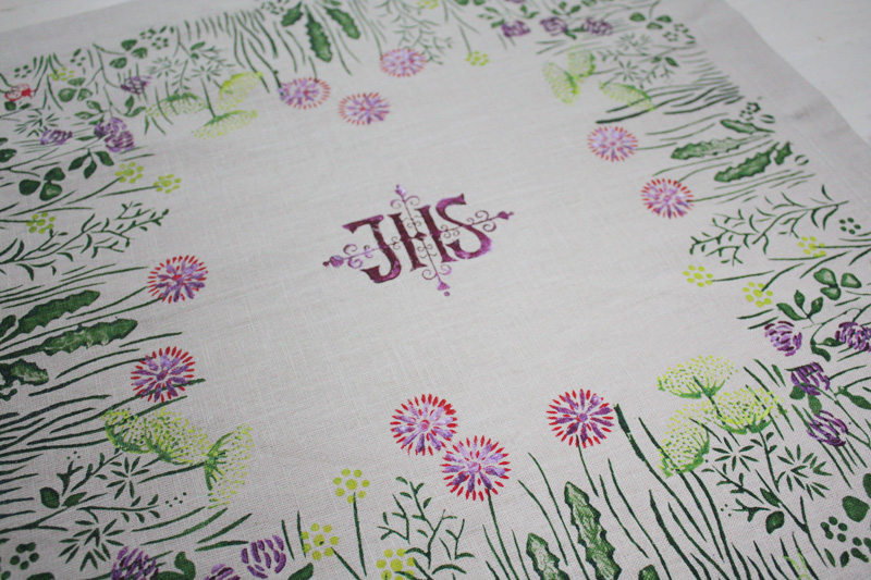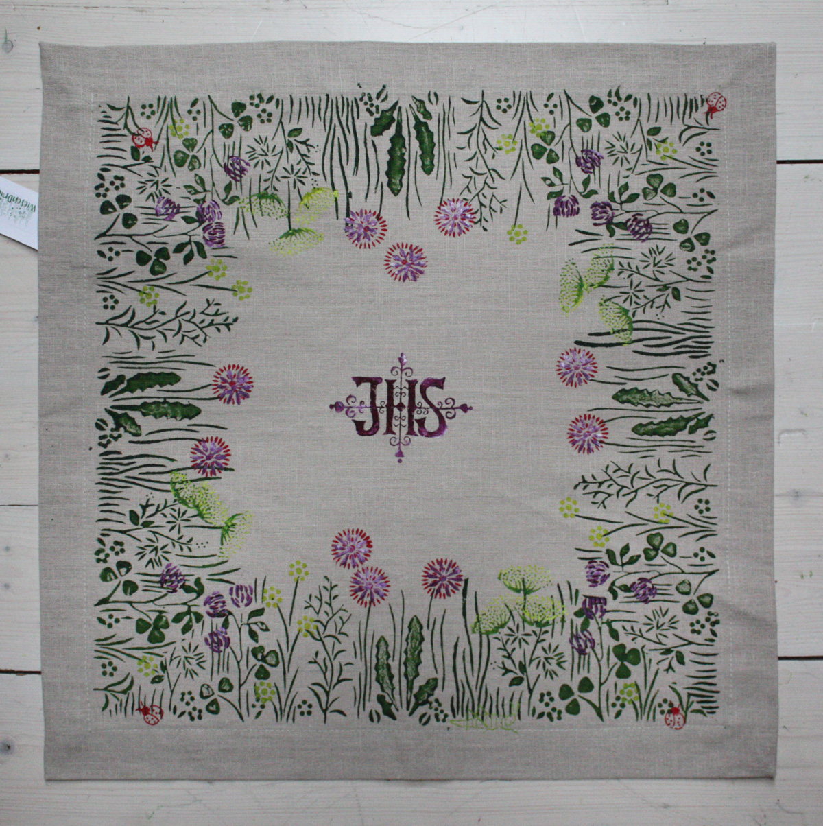 €39.00Schafgarbe, violettem Klee und Löwenzahn in der Wiese, in der Mitte ist das IHS Monogramm. Maße: 50 x 50 cm